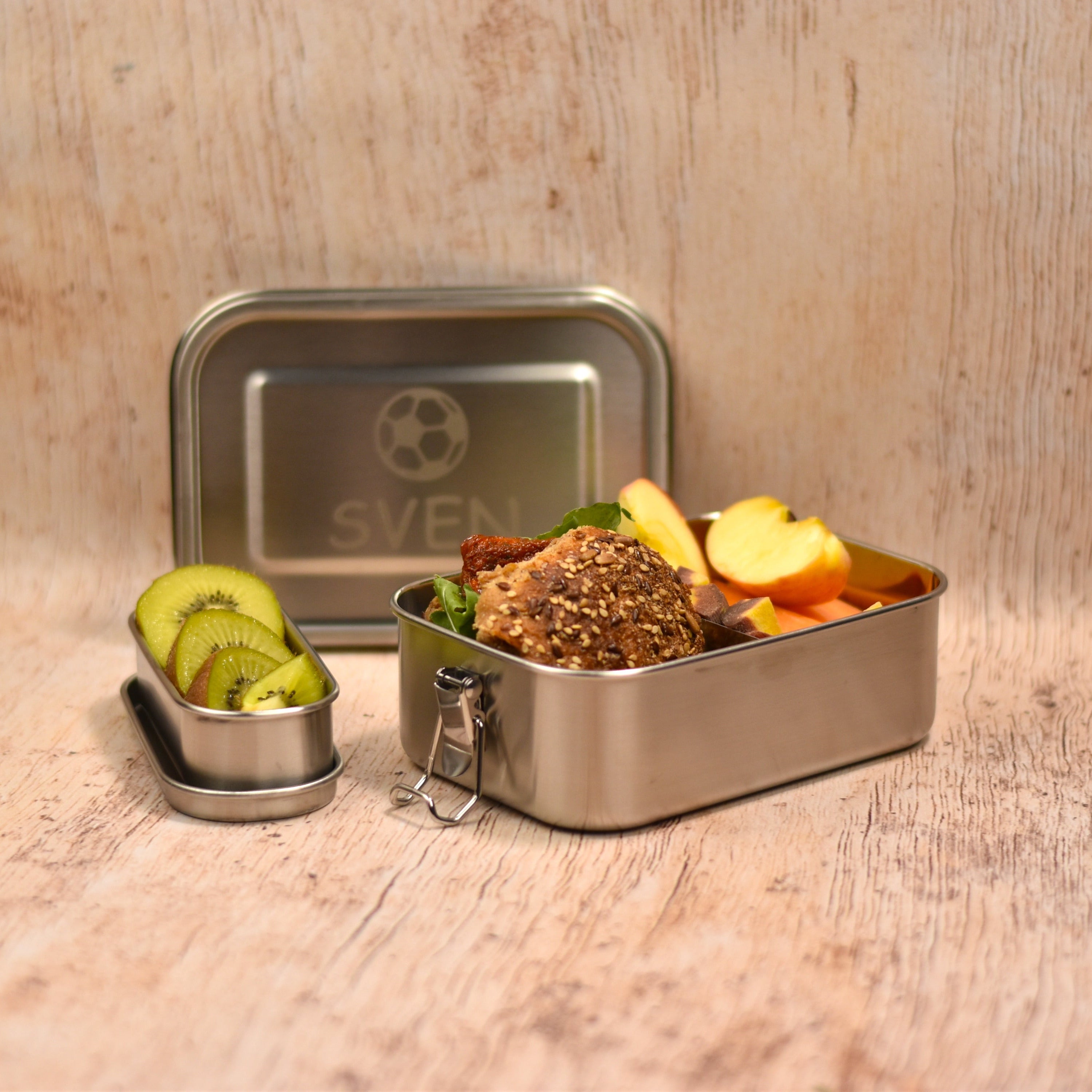 Unsere Edelstahl-Lunchbox in der Größe 800ml mit Gravur und unser Snackbehälter aus Edelstahl mit Gravur zählen zu unseren beliebtesten Geschenken.